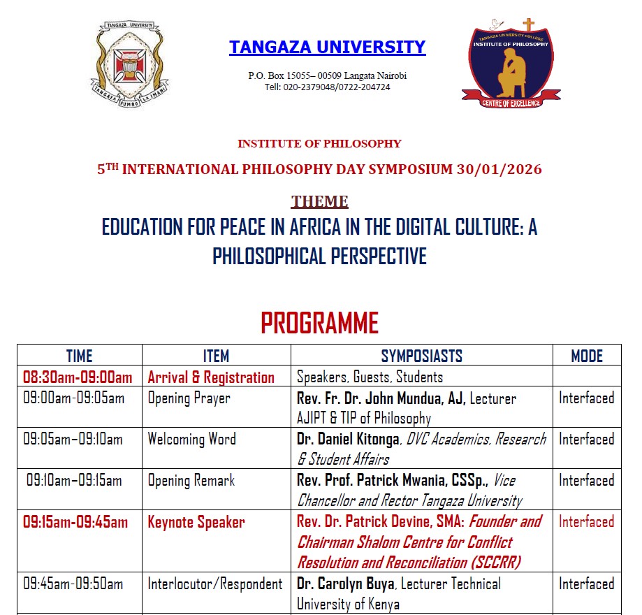 The 21st-century digital landscape has radically reshaped how knowledge is produced, distributed, and consumed across Africa. While digital culture offers new opportunities for access, innovation, and intercultural exchange, it also introduces ethical challenges including cyber-violence, misinformation, polarization, and socio-economic exclusion. In this context, education for peace becomes not only a pedagogical concern but a deeply philosophical one: What kind of human being should digital learning cultivate? Which values, virtues, and forms of rationality support harmony in technologically mediated societies? How can African philosophical traditions and indigenous knowledge systems enrich peace education for a digital age? The next Tangaza International Philosophy Day Symposium event seeks to develop forward-looking philosophies of education that empower African learners to become agents of peace, and responsible digital citizens in an inclusive technological culture. The organizers therefore invite original abstracts and papers that critically engage with such philosophical questions of peace-oriented education in Africa’s digital era. Interdisciplinary contributions are welcome, including philosophy, education, technology studies, communication, sociology, religious studies, and African studies.